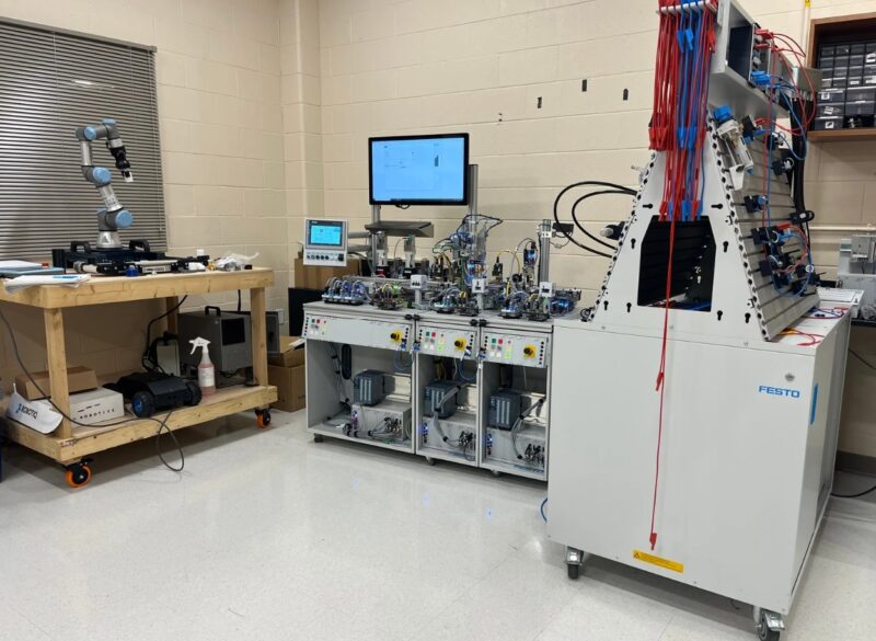 Dr. Ashraf Omran, an expert in automation controls, runs the state-of-the-art lab. He held an Operational Control Lab Professional Development Workshop for high school instructors to help them teach their students about automation process and controls. Instructors used Festo Didactic training systems in the lab to get hands-on experience with valves, meters, PLCs, and more.