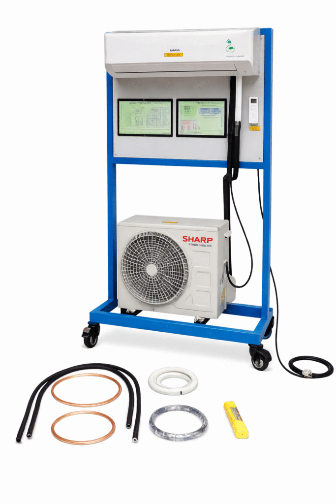 The Heat Pump Trainer - Inverter gives learners a complete air conditioning system to explore and analyze. It provides an up-close experience with components and functions, remote control systems, modes of operation, and P-H diagram plotting.